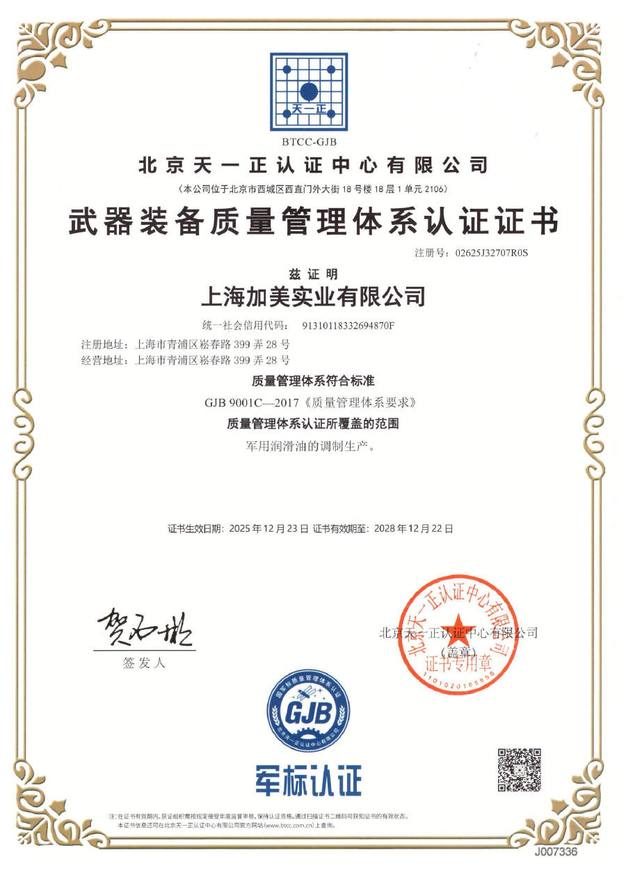 近日,上海加美實(shí)業(yè)有限公司(以下簡(jiǎn)稱(chēng)“上海加美”)成功通過(guò)GJB9001C-2017武器裝備質(zhì)量管理體系認(rèn)證,并榮獲權(quán)威認(rèn)證證書(shū)。這標(biāo)志著上海加美在潤(rùn)滑油及精細(xì)化工產(chǎn)品的設(shè)計(jì)、開(kāi)發(fā)、生產(chǎn)和服務(wù)領(lǐng)域的質(zhì)量管理體系,已完全滿(mǎn)足國(guó)家軍用標(biāo)準(zhǔn),具備了為國(guó)防科技工業(yè)提供高標(biāo)準(zhǔn)、高可靠性產(chǎn)品與服務(wù)的資格與能力。此舉不僅是公司發(fā)展史上的一個(gè)重要里程碑,更是其長(zhǎng)期堅(jiān)持“質(zhì)量就是生命”理念的權(quán)威印證。