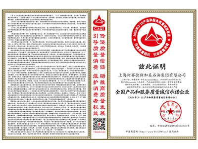 誠(chéng)信,是企業(yè)立身之本;質(zhì)量,是企業(yè)發(fā)展之基。上??沦惖滤辜用朗图瘓F(tuán)有限公司將以此次入選“全國(guó)產(chǎn)品和服務(wù)質(zhì)量誠(chéng)信承諾企業(yè)”為新的起點(diǎn),繼續(xù)秉持“馳騁能量,信賴(lài)之選”的品牌承諾,以軍工品質(zhì)鑄就質(zhì)量豐碑,以誠(chéng)信服務(wù)守護(hù)消費(fèi)者信任,為推動(dòng)潤(rùn)滑油行業(yè)高質(zhì)量發(fā)展、助力中國(guó)制造轉(zhuǎn)型升級(jí)貢獻(xiàn)更大力量!